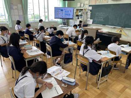 教室に入ると、し〜んと静まり返っていて、全員が下を向いて目は開いたまま...。どうしたのかと思って近づくと、理科の学習で脈を測っていました。この後、運動場で軽い運動後の脈も測っていました。人によって倍くらい差が出る脈に興味関心が高まっていました。