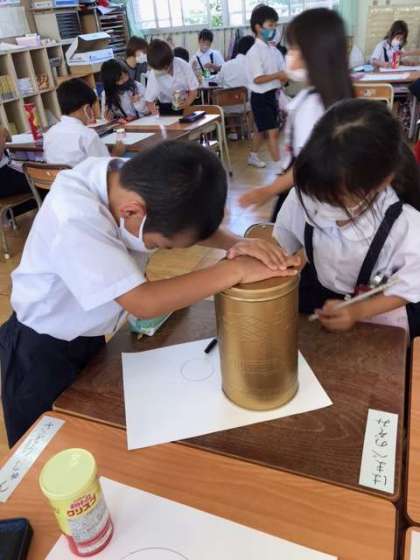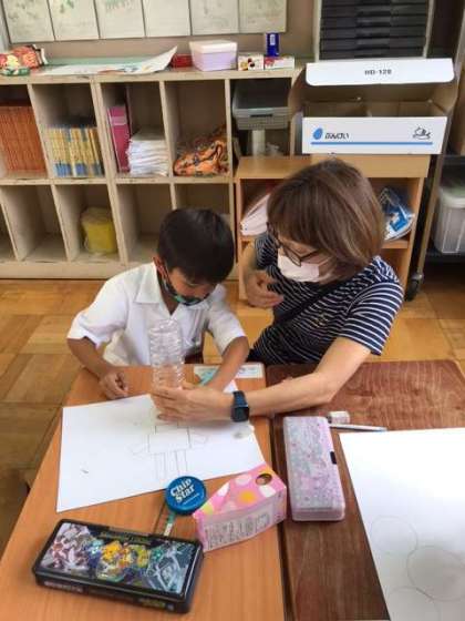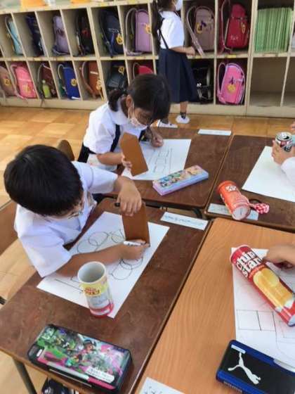 お家から持ってきた箱や容器の面の形を写して絵をかきました。