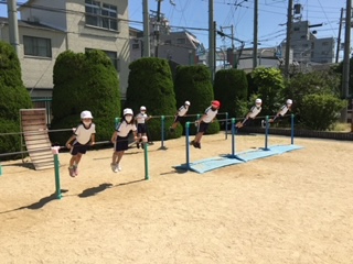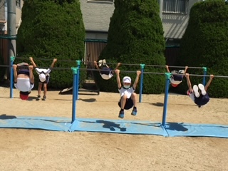体育の時間では、鉄棒で「つばめ」や「足抜き前回り」、「逆上がり」などを練習しています。得意な子は苦手な子に優しく教えてあげる様子も見られました。