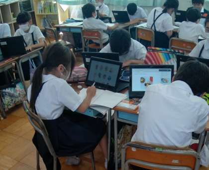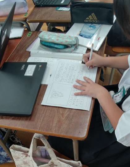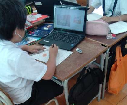 班でテーマを決めて分担して調べた事を一つにまとめて新聞にします。みんなで相談しながらインターネットで調べた事を記事にしていました。