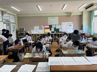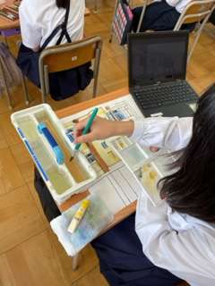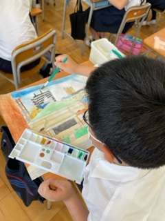 一人一台端末で撮った校舎の写真を見て、水彩絵の具で丁寧にかいています。