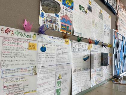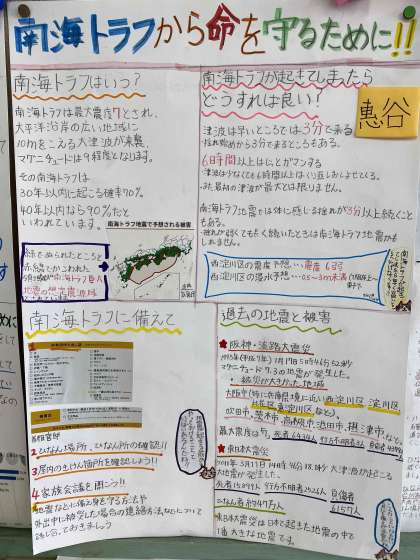 英語のチャレンジタイムを見に行くと、しっかり調べて書いたことがよくわかる新聞が掲示されていました。阪神大震災や東日本大震災など、同じレベルの災害がいつ発生してもおかしくない状況ですので、自分の事として捉えて学習することが大切です。明日の参観時にぜひご覧ください。