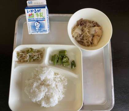 ごはんがどんどん進むすき焼き煮に子どもたちも自然と笑顔になっていました。また、オクラのかつおうめ風味はあっさりしていて今日のおかずによくあっています。