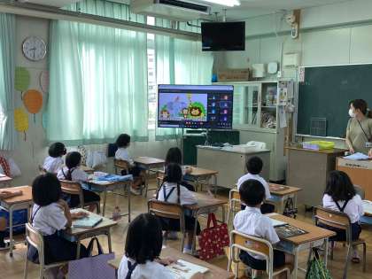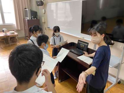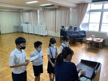 今回は、同じグループの時に拍手を1回するというゲームでした。例えば、犬.猫.熊.カバ....カバンこのように動物の時は拍手、動物以外は手をたたかない。最初は騙される児童もいましたが、最後の方は慣れて上手に行うことができました。