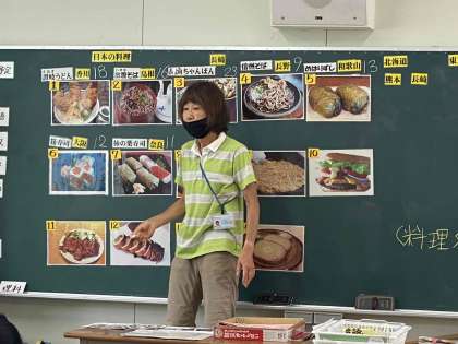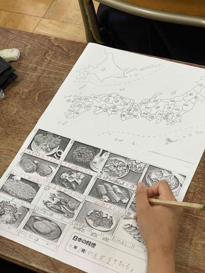全国各地のご当地グルメと都道府県の位置をリンクさせながらワークシートに書き込んでいます。