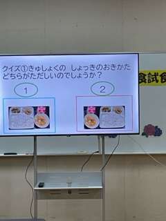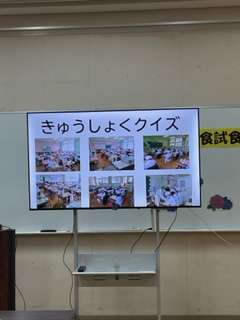 一年生の保護者による給食試食会が行われました。子どもたちが普段食べている間に見ている「給食クイズ」の映像を見ながら食べていただきました。