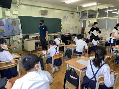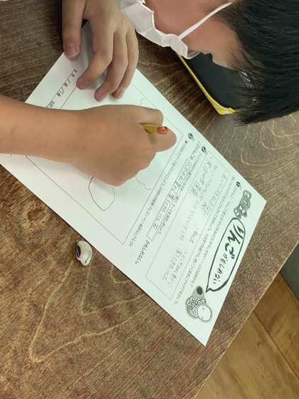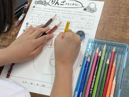 1組は美術の先生に教えていただきました。りんごに見えるけど本当は〇〇かもしれない。この〇〇を何に例えるかは自由です。子どもたちはあふれる想像力を働かせて楽しそうに描いていました。
