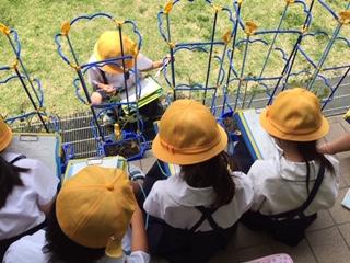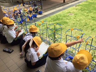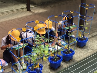 2年生では、ミニトマトを育てています。観察シートには、トマトを観察して「におい」や「触ったこと」などを書いていました。赤くなり始めているトマトもいくつか見つかりました。おいしいミニトマトを収穫する日はもう近いかもしれません!