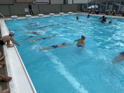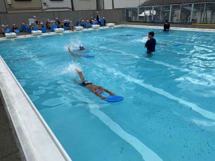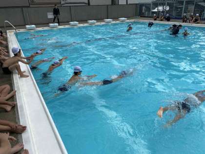 雨雲が落ち着いている間にプール水泳を行いました。けのびやバタ足など、だいぶ上手にできるようになってきました。