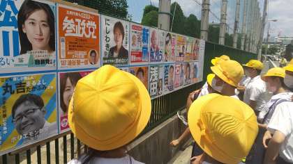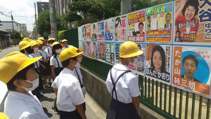 6年生は1学期に社会科で政治や選挙について学習しました。今週月曜日の朝会で校長先生からも選挙ポスターについてのお話がありました。学習したことを身近に感じるチャンスとして、正門横のポスターを実際に見に行きました。