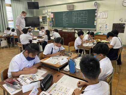 今日はC-NETのアンガー先生と時間割を作る学習を行いました。社会はsocial study など確認しながら表を完成させました。