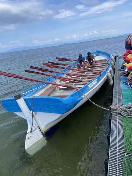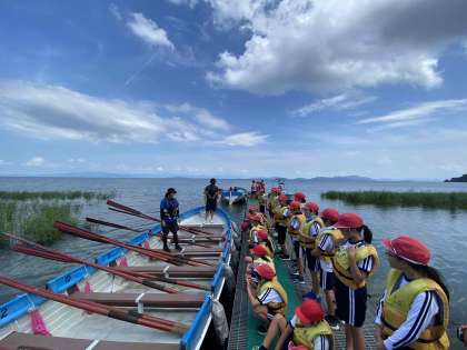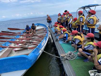 カッターを前に説明を聞いています。