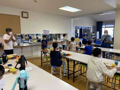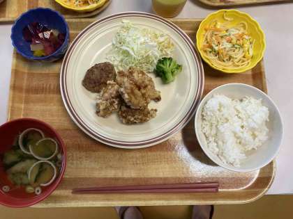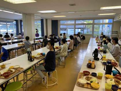 夕食タイムです。唐揚げなど美味しそうなメニューに子どもたちのテンションは上がり気味ですが、そこは黙食。少し我慢して食べています。