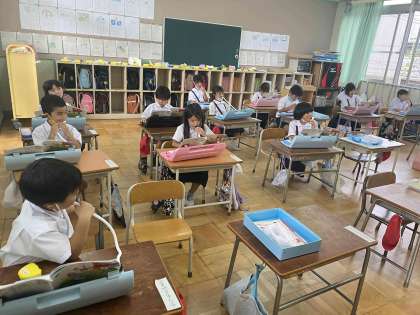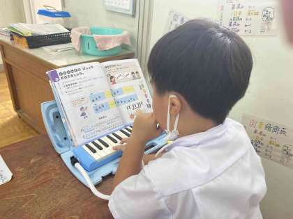 音楽科の学習で鍵盤ハーモニカを練習しています。親指を「ど」において順番に..。これが難しい。指がつりそうになりながら一生懸命練習しています。