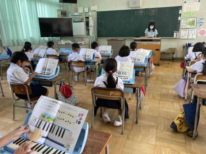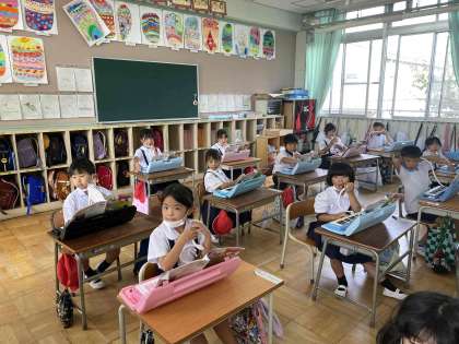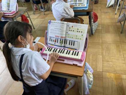 鍵盤ハーモニカで「どんぐりさんのおうち」などを練習しています。「ド」の親指から「ソ」の小指まで自在に使えるように指がつりそうになりながら一所懸命練習しています。