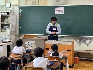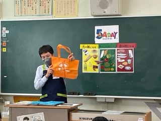 スーパーライフの方に出前授業をしていただきました。事前にDVDで工場の様子などを見せてもらい、いろいろ質問をしました。そのあと、食品ロスのことや5ADAYの話をききました。5ADAYとは、1日に5種類の野菜を食べようという活動です。