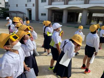 遮光板を使って太陽とかげの位置を観察しました。