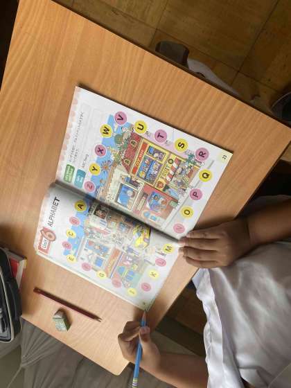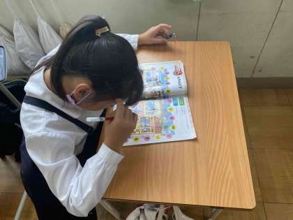 教科書の中のイラストに隠れたA〜Zのアルファベットを探しています。このようにして少しずつ英語に慣れ親しんでいきます。