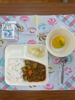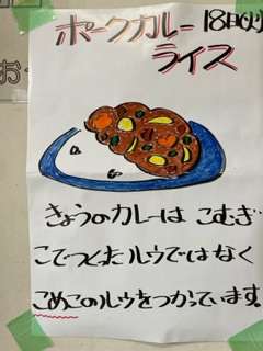 学校のカレーライスには、ポークの他に牛肉や夏野菜、冬野菜などいろいろなカレーライスがあります。今日のカレーライスはポークがメインでカレールーのもとには、米粉が使われています。ラッキーにんじんも使われており、星やクマ、ハートなどの形のにんじんが入っている時もあります。