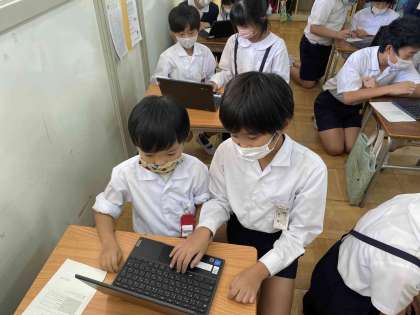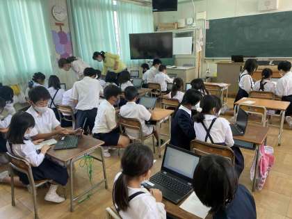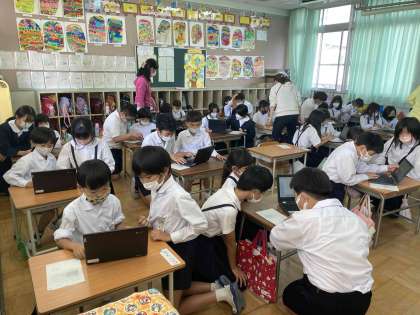 他学年と同じように一人一台PCが1年生にも届きました。最初に設定が必要なのですが、6年生が1年生と一緒にササっと設定し、使い方を教えてあげていました。頼もしい限りです。
