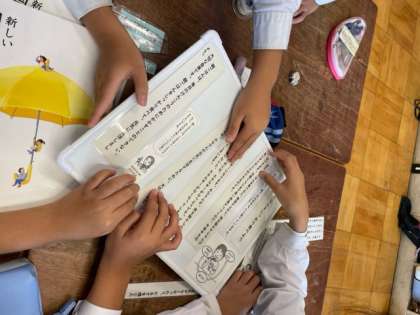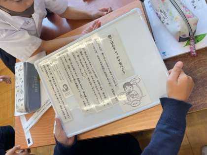 「ほけんだより」を読みくらべようの単元で教科書に載っている2つのほけんだよりをバラバラにしたものを組みかえる活動をしました。今まで学習したことを思い出しながら班で一生懸命並び替えていました。
