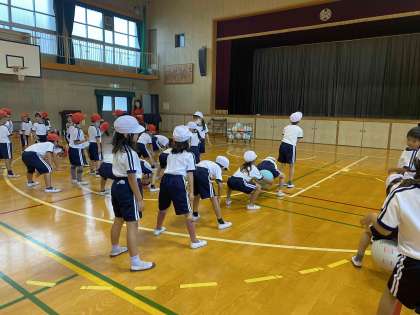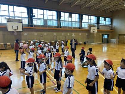 今日は交流会があったので、講堂でボールを使って運動しました。