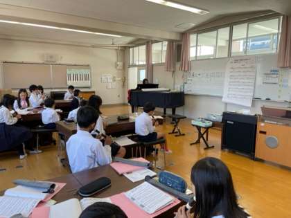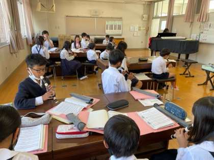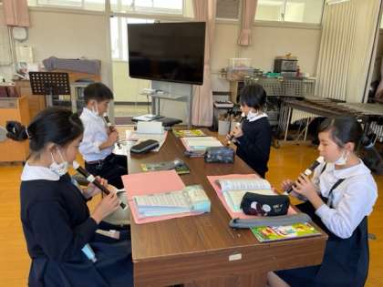 星笛をリコーダーでふいています。みんなで息を合わせて練習しています。集中して頑張っていました。