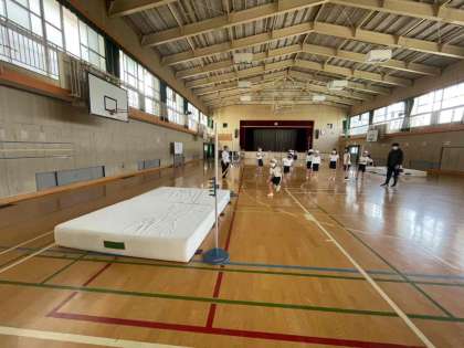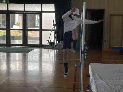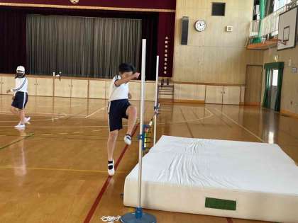 高跳びの学習を行っています。リズムよく助走し、勢いをつけて踏み切るにはどうすればよいのか。何度も練習しています。