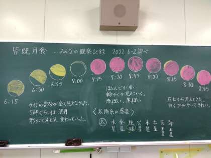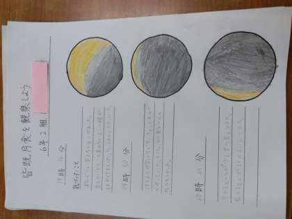 昨晩の歴史的天体ショーを観察する宿題の報告会を行いました。みんなの観察記録を合わせると、皆既月食の様子がよくわかりました。