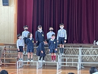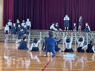 講堂で学習発表会練習をしました。3年生は「天満のとらやん」が世界中に旅する話をします。2年前(現在5年生の発表)登場したウナギが今日から参加しました。