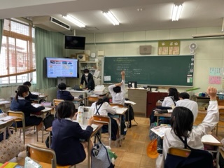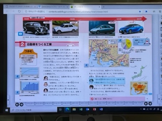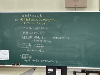 自動車工業の学習をしています。自動車に興味がある子が多く、先生にいろいろ質問していました。