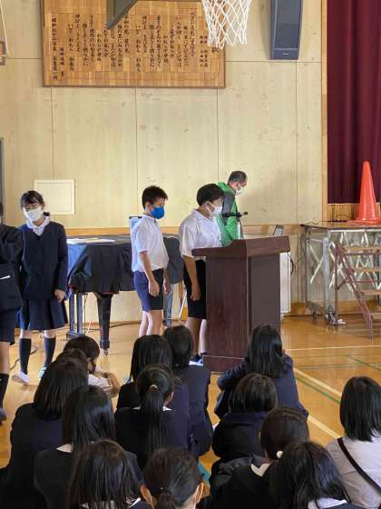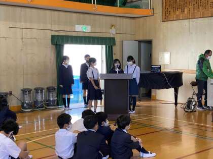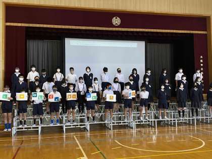 今日はグループでの発表のほか、ひな壇でプレートをもって発表しました。声の音量やスピードなど本番に向けて仕上げていきます。