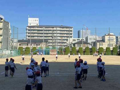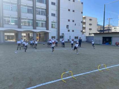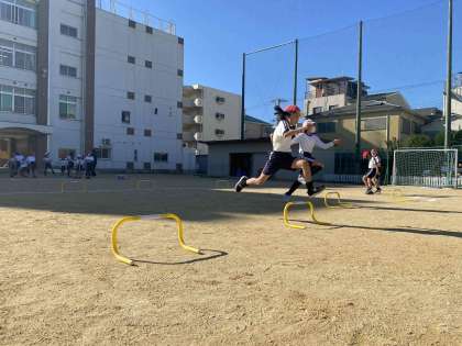 ミニハードルを使ってリズムよく跳んでいく練習をしています。
