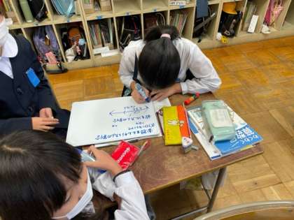 割合の学習をしています。友だちと自分の考えを共有し、発表しています。