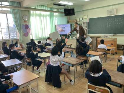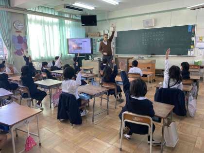 紫が好きな児童がいて、アンガー先生に聞かれてすぐに「パープル!」と元気よく答えることが出来ていました。