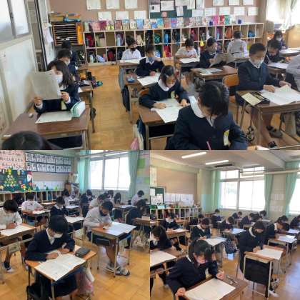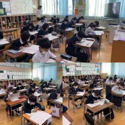 今日と明日の2日間で学力経年調査が実施されます。今日は、国語と社会、明日は算数と理科になります。各クラス真剣に試験に挑んでいました。