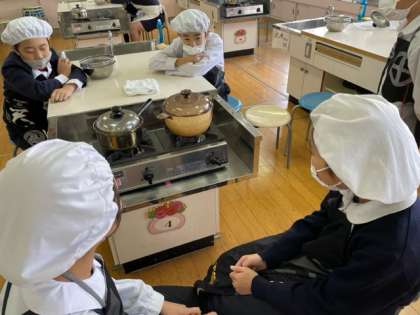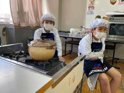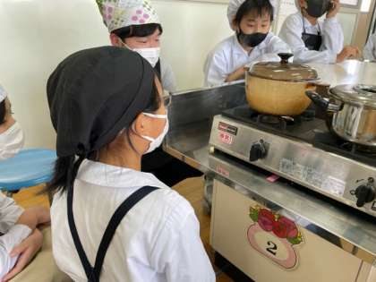ご飯が沸騰するのに大興奮しています。みんなで見守っています。
