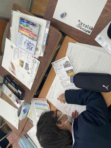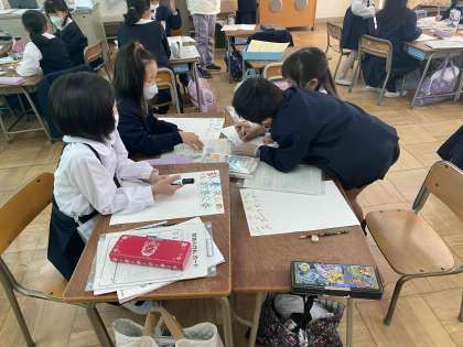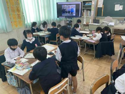 町探検で行った派出所やスポーツセンターの事を紹介するためにまとめています。内容など何を書けばよく伝わるのか考えながら学習を進めています。