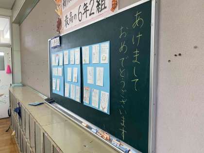 教室の後方掲示板には、担任の先生に書いた年賀状が掲示してありました。また、3学期の学習ファイルなど、準備完了です。短い学期ですが、学習プリントはたくさんあるようです。