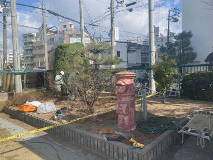 運動場北側にあるカイヅカイブキという高い木ですが、見通しが悪く死角にもなるので、大阪市の園芸事務所にお願いし、剪定などをしていただくことになりました。まだ工程の半分程度ですが、かなりスッキリしてきました。