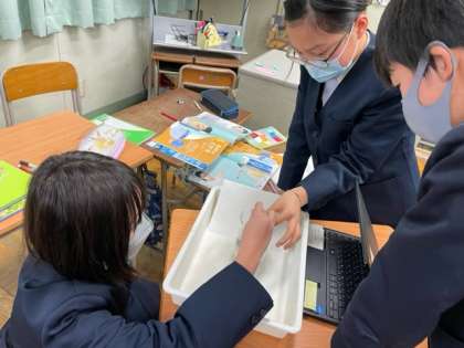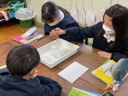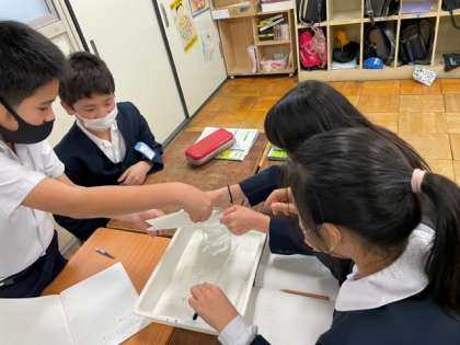 『もののとけ方』の単元で、食塩とミョウバンを水に入れてとかしています。とける様子から、気づいたことを話し合いました。