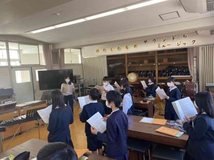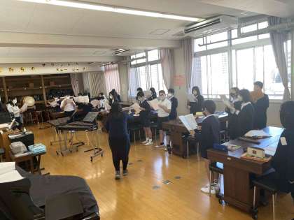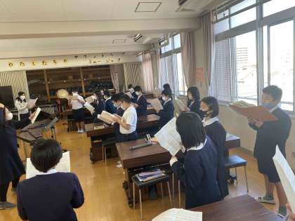 合唱や合奏などに取り組んでいます。合奏は、劇場版ワンピースの新時代という曲です。中々難しいですが力を合わせて練習しています。