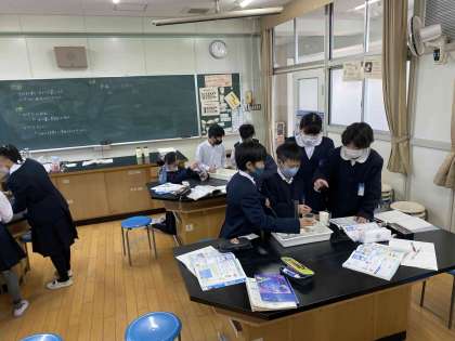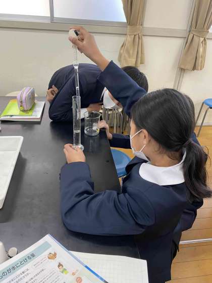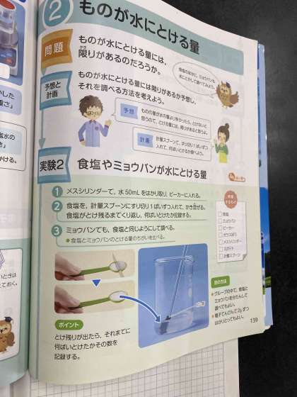 「ものが水に溶ける量」の学習を行う中で、今日は理科室で実験を行いました。食塩とミョウバンが何杯ずつ溶けるのか、溶ける量に限界はあるのか。記録をとりながら実験を進めました。