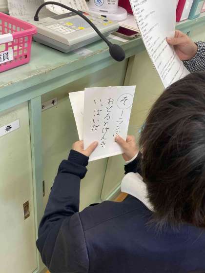 読み手が聞きやすいように工夫しながら間を考えて読んでいました。最後の児童はかるたの本格的な読み方で読むことができていて感心しました。