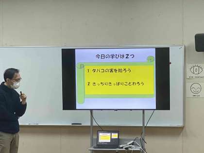 西淀病院の先生に来ていただき、タバコの害について授業をしていただきました。タバコには200種類の有害物質があり、百害あって一利なし。また、ニコチンやタール、一酸化炭素など、依存を高めたり歯が変色したりする物質が含まれていることを知り驚いていました。