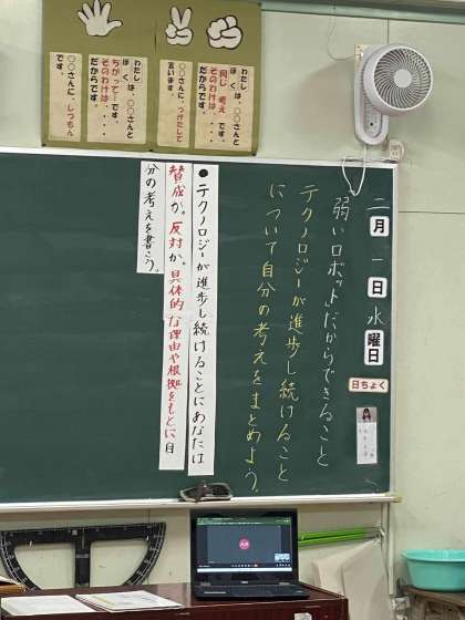 今日は自分が賛成なのか反対なのかを判断してから根拠を書くという課題です。ロボットやテクノロジーが発展することによる人間への影響を考えながら書けていました。また、その結果をグループで交流しました。