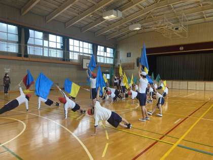 フラッグの練習を行っています。フラッグを振るたびに「バサっ」「バサッ」とカッコイイ音がして迫力満点です。本番を楽しみにしていてください。