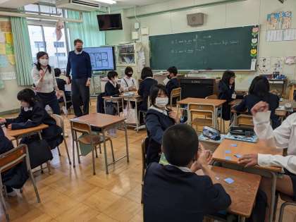 中学校生活の部活動に向けて英語でコミュニケーションを取り合っています。盛り上がってみんなで活動しました。キーワードゲームでカードを取り合って練習しました。ラッキーカードを持っていたら1点で、競い合いながら英語に親しんでいました。
