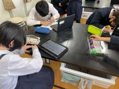 今日はプラ板を作っています。自分だけのオリジナルなので、好きなキャラクターや好きなアーティストなどを描いています。みんな真剣に取り組んでいます。