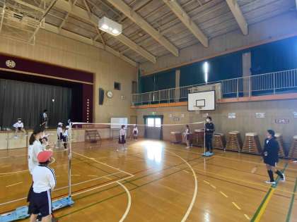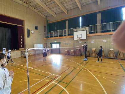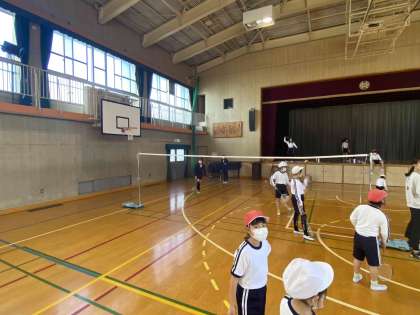 講堂で試合を楽しみました。ラケットの扱いも上手になり、ラリーが続くようになりました。